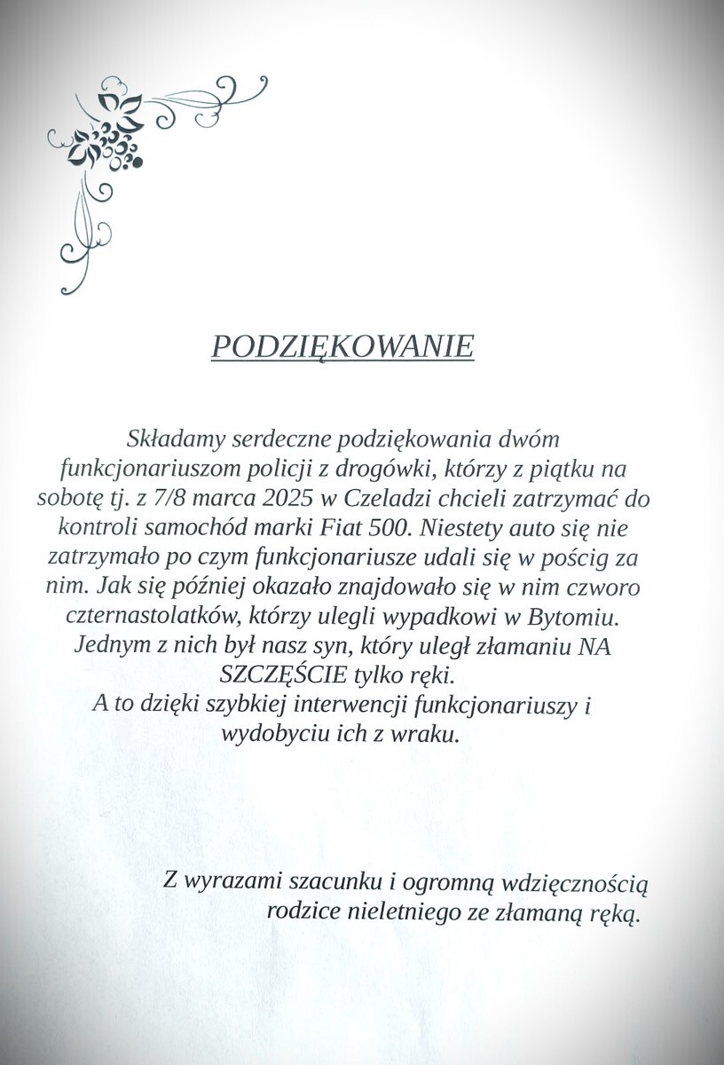 Jak się okazuje, to właśnie czeladzcy policjanci prowadzący pościg za fiatem natychmiast ruszyli na ratunek i wyciągnęli wszystkich pasażerów rozbitego auta tuż przed tym, nim auto stanęło w płomieniach. Syn rodziców, którzy podziękowali policjantów, doznał w wyniku tego wypadku tylko złamania ręki.