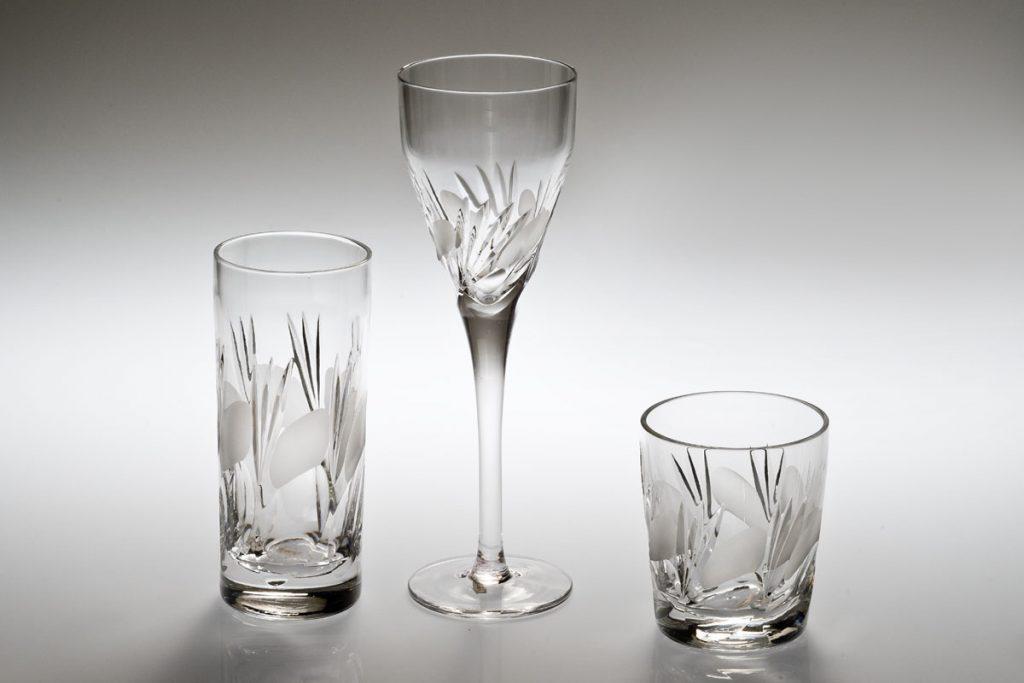 S. Sadowski, kieliszek i szklaneczki z zestawu do napojów, pocz. l. 90. XX w., Huta Szkła Gospodarczego „Sudety”, zbiory: Muzeum Ziemi Kłodzkiej.