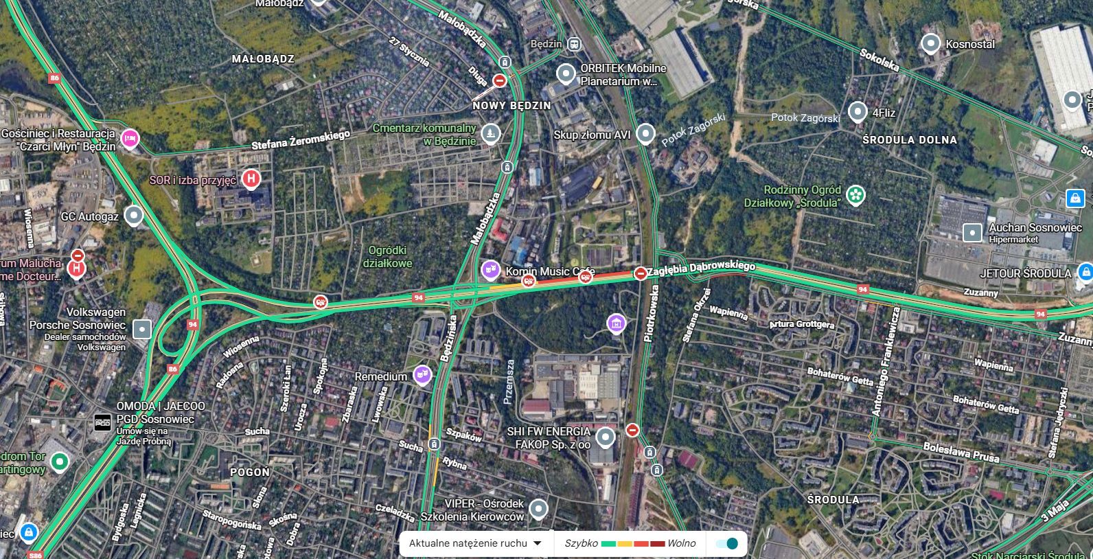 Jeden pas ruchu na Katowice, na wysokości elektrociepłowni, wciąż jest nieprzejezdny. Tworzą się korki.